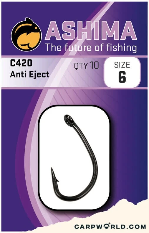 De anti eject 420 haak prikt snel en daardoor is de kans op het losschieten van de vis minimaal. Doordat de haakpunt naar binnen staat blijft deze langer scherp op gravel of zandbodems. Tevens wordt deze haak veel gebruikt op dressuur wateren. De 420 anti eject haken zijn voorzien van een mat-zwarte coating ontwikkeld door Ashima. Deze haak is te verkrijgen in de volgende maten 2, 4, 6, en 8.. Verpakt per 10 stuks.