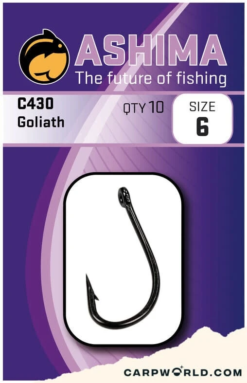 De goliath 430 haak is door zijn langere steel en rechte haakpunt een zeer snelle prikker. Deze haak wordt veel ingezet op zwaar beviste water waar de vissen voorzichtig azen. Door zijn lange dunne punt is de haak vlijmscherp en zal sneller prikken dan menig ander haak. Ideaal in combinatie met een korte line aligner. De 430 goliath haken zijn voorzien van een mat-zwarte coating ontwikkeld door Ashima. Deze haak is te verkrijgen in de volgende maten 2, 4, 6, en 8. Verpakt per 10 stuks.