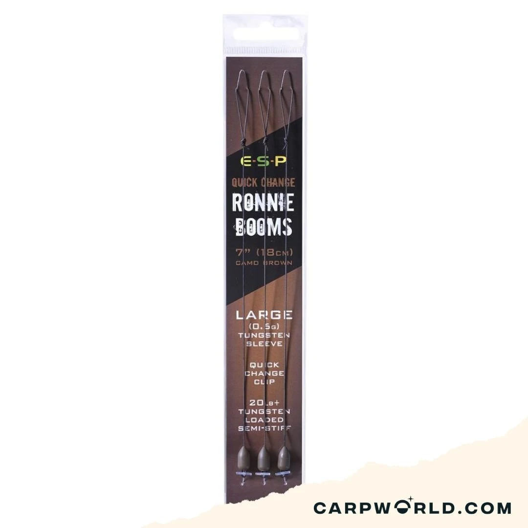 ESP maak het vissen met een Ronnie of Hinged (Stiff) rig nu wel heel eenvoudig. Met de kant en klare Quick Change Boom kun jij supersnel en eenvoudig wisselen van rig en zodoende inspelen op de omstandigheden. Is je haak bot na een gevangen karper? Geen punt, binnen twee seconden kun jij weer aan de slag. De Quick Change Boom is aan de ene zijde voorzien van een lus die je eenvoudig aan een Quick Change wartel kunt bevestigen. Aan de andere zijde is een Ronnie Clip bevestigd die is afgewerkt met een 0,6 gr Tungsten Sleeve. Hier kun je eenvoudig een Ronnie of Chod rig aan bevestigen. Zodoende kun je met de Boom zowel met een Ronnie rig als met een Hinged (Stiff) rig aan de slag. De Ronnie Boom is perfect te combineren met de ESP Ronnie Rigs en ESP Cryogen Chod Rigs.