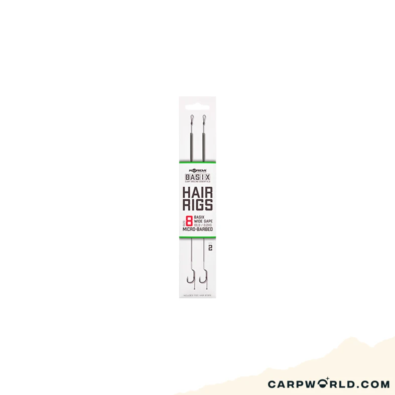 De BASIX Ready Tied Hair Rigs zijn klaar om gelijk uit de verpakking gebruikt te worden. Je hoeft enkel nog een bodemaas of wafter toe te voegen en je bent klaar om te vissen. De rigs zijn geknoopt met het camo green gekleurde BASIX Coated Hooklink materiaal. Een klein gestript stukje bij de BASIX Wide Gape haak zorgt voor bewegingsvrijheid en grotere kans op goede inhaking. De onderlijn heeft een soepele hair die is voorzien van een stukje silicone die hem op zijn plek houdt en de kans op in de war werpen verkleint. De lengte van de hair is geoptimaliseerd voor haakaas formaten die passen bij de gekozen haakmaat.